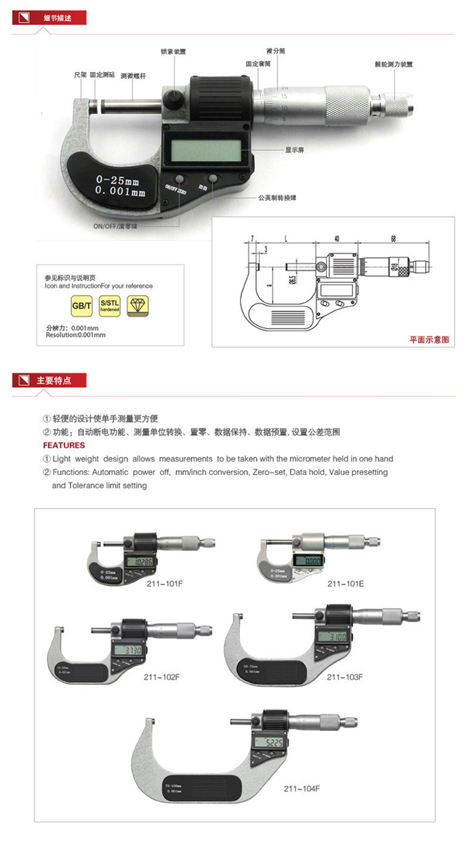 | 211-101F | 外徑數(shù)顯千分尺 | 0-25 | ±0.002 | 31 | 25 |