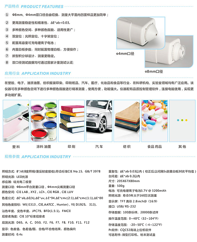 智能手持式電腦色差儀,外形小巧,適合多種場合的顏色檢測和控制,是服裝廠、化工廠、印刷廠、汽車制造廠、五金加工廠、模具廠、涂料廠等生產(chǎn)中顏色管理的選擇。同時這款儀器性能穩(wěn)定,原機自帶顏色管理軟件,增加色差儀的使用范圍和功能性。 聯(lián)系電話,021-6573 0171 |