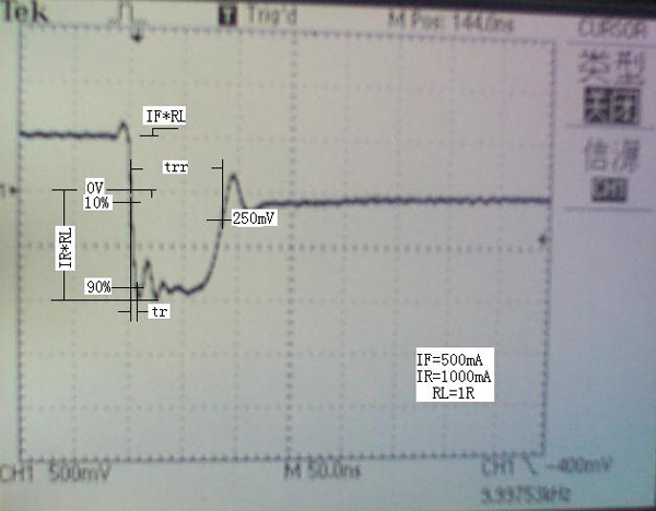 (3)要注意恢復時間是對溫度極其敏感的參數,而且敏感程度和工藝關系很大。例如;手直接拿管子和同一管子長時間測試,均會使trr值顯示變大。