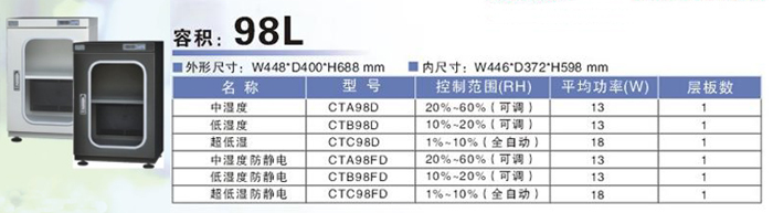 | CTA98D | 中濕度防潮箱 | 20-60% | 98L | 446*372*598 | 1 | 448*400*688 |