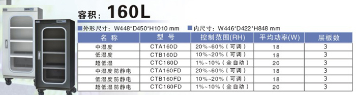 | CTA160D | 中濕度防潮箱 | 20-60% | 160L | 446*422*848 | 3 | 448*450*1010 | 同上 |