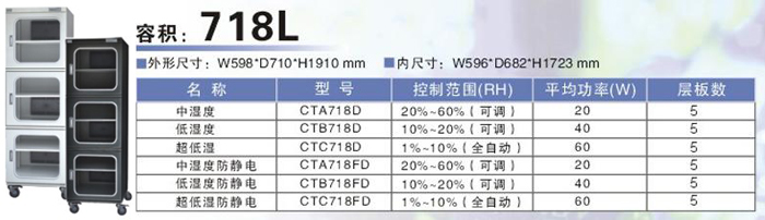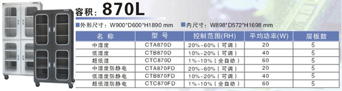 | CTA435D | 中濕度防潮箱 | 20-60% | 435L | 898*572*848 | 3 | 900*600*1010 | 同上 |