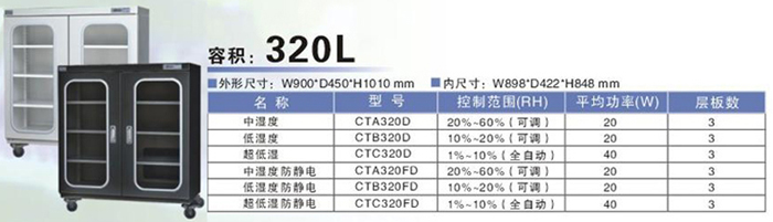 CTC320D 超低濕度防潮箱 1-10% 320L 898*422*848 3 900*450*1010 同上