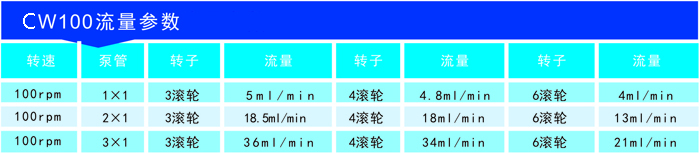 | CW100-四滾輪1通道 | 蠕動(dòng)泵 | 1通道 | 0.1-100rpm | 0.004-36ml/min |