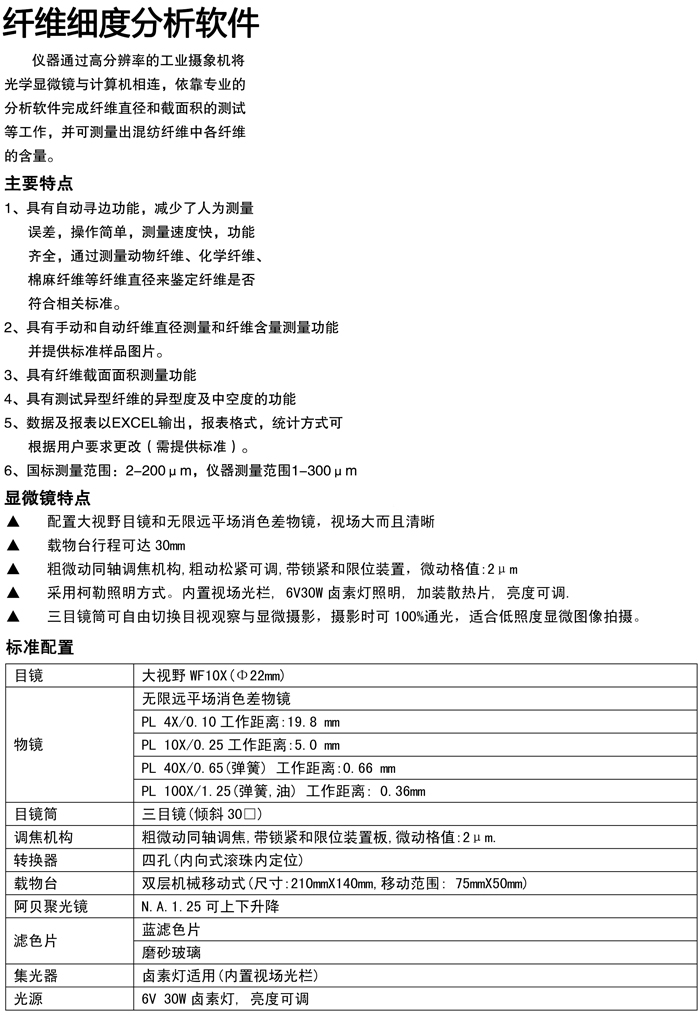 1、該產品是新型人機交互式纖維直徑測量分析儀,用過高分辨率的工業攝像機將光學顯微鏡與計算機相連,依靠專業的分析軟件進行纖維直徑和截面積的測試。