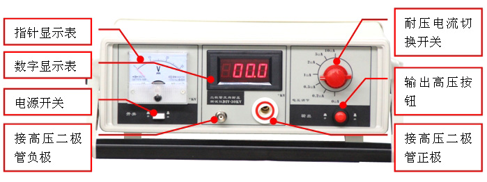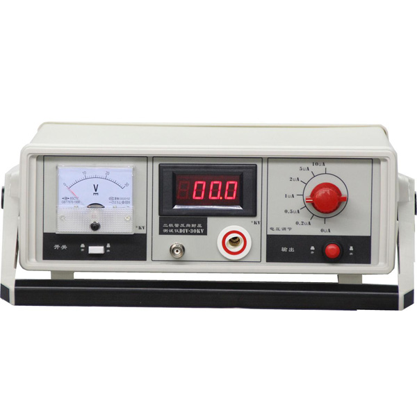 DIV-30kv系列二極管反向時間測試儀 高壓二極管反向耐壓測試儀 一、主要特點 A: 高壓模塊全固態、無火花,開關干擾小 B: 可調范圍大 C: 自帶高精度連續可調高壓源 D: 適應性強 E: 輸出電壓高 | F: 多檔耐壓恒流值切換 G: 高可靠性 (過流、過熱、短路保護) H: 電源穩定度高 I : 數字顯示與指針顯示 J : 輸入220VAC50Hz市電 |