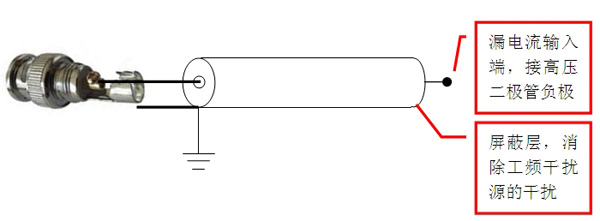 圖2 DIV-30KV產品后面板示圖 斷開電源的情況下,對電源設備進行連線; 二極管連接DIV-30KV輸出正高壓負輸入; 二極管連接DIV-30KV輸出正高壓正輸入; 對測試高壓二極管做好絕緣處理; 連接電源線。 漏電流輸入端,接高壓二極管負極 屏蔽層,消除工頻干擾源的干擾  圖3 二極管負極引線結構 負極引線是同軸屏蔽線,具有雙重結構,屏蔽層用于消除外界干擾,軸線用于真實信號傳輸,在做二極管工裝時候,應該講屏蔽層和工裝的殼金屬相連。 注意:電源可靠接地。 2、二極管耐壓測試步 打開電源開關; 旋轉切換開關,選擇測試漏電流數值; 確保連續可靠,絕緣處理合理,此時按下輸出按鈕; 根據數字電壓表和指針電壓表數值讀數; 讀完數值后,松開電壓輸出旋鈕,此時高壓開始泄放; 觀察電壓顯示表數字,高壓電壓泄放完畢后,方可進行其余拆裝工作; 注意:若數字電壓表不亮,必須立即關機,檢查連線是否正確。若是設備故障,請與生產廠家聯系,不得擅自打開儀器,否則不保修。 3、關機:須先將電流調節旋鈕調到零,再按下電源開關。 4、以上步驟正常,說明儀器完好,可投入試驗。(再次開機須間隔至少一分鐘)。 5、過熱保護,若實驗過程中輸出瞬間停止,顯示表正常工作,指示燈正常工作,則是過熱保護電路動作,不用任何操作,待內部溫度下降自動恢復工作狀態。 五、DIV-30KV尺寸  電源尺寸: 長290mm * 高270mm*深120mm(不包括前后面板上的按鈕、保險絲座、插頭、導線的引出長度)。 六、注意事項 1、注意防震、防潮及防塵。 2、如果一切電源接入220V市電,打開電源開關,電源指示燈不亮,拔掉電源線用一字口螺絲刀向外啟開電源保險絲座檢查保險絲是否斷開,若保險絲斷開換上新的6A250V保險絲。 3、儀器從低溫處移至高溫處時,應放置數小時待設備溫度接近空氣溫度時,再開機使用,以免設備內部產生凝露影響正常試驗。 4、如環境濕度大,不易開機。若受潮嚴重,須進行干燥處理,可放于干燥室內或用紅外輻射取暖器加熱干燥。 5、試驗完畢,必須待電源充分放電后,才允許進行高壓線的拆除和換接線工作。 6、試驗時,被試品和高壓引線的周圍必須有500px的安全距離。 7、定期檢驗風扇,以確保機箱內部通風正常。