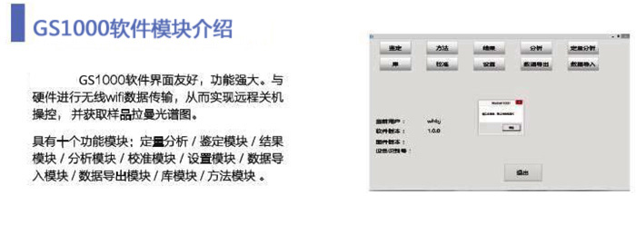 GS1000拉曼光譜儀是一款應用于制藥行業,科研院所及快檢行業現場檢測的高靈敏度,高穩定性的便攜式光譜儀. GS1000超群的性能源于其核心部件采用的是科研級光譜儀,高通量光纖探頭以及背照式TE制冷CCD陣列檢測器,通過集成操作流暢的移動終端和功能豐富的專業軟件,獲得超出用戶期望的使用體驗. 聯系電話,021-6573 0171 |