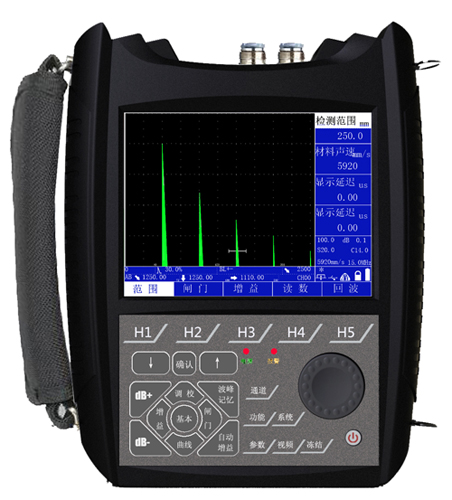 CFUT600型數字超聲波探傷儀概述: CFUT600型數字超聲波探傷儀是一種便攜式工業無損探傷儀器,采用數字大屏幕顯示,它能夠快速便捷、無損傷、進行工件內部多種缺陷(裂紋、夾雜、氣孔、焊縫等缺陷)的檢測、定位、評估和診斷。既可以用于實驗室、車間,也可以用于工程現場。本儀器能夠廣泛地應用在制造業、鋼鐵冶金業、金屬加工業、化工、學校等需要缺陷檢測和質量控制的領域,也廣泛應用于航空航天、鐵路交通、鍋爐壓力容器等領域的在役安全檢查與壽命評估。它是無損檢測行業的儀器。超聲波在被測材料中傳播時,可根據材料的缺陷所顯示的聲學性質對超聲波傳播的影響來探測其缺陷。根據此原理,利用超聲波可以測量各種金屬材料、部分非金屬材料、復合材料等介質內的裂縫、氣孔、夾雜等缺陷信息。 功能介紹: ☆DAC、AVG曲線自動生成,取樣點不受限制,并可進行補償與修正 ☆發射脈沖頻率可調,大可達1000次/秒 ☆10個獨立探傷通道,可自由設置和存儲多種探傷工藝和標準,現場探傷無需攜帶試塊 ☆可處理大6米量程的回波信號 ☆檢測過程實時動態錄像并回訪,錄像時長累計大50分鐘 ☆5.7寸TFT彩屏顯示,用戶可以按照環境自行設備屏幕顏色 ☆單探頭、雙探頭、穿透等多種探傷工作方式 ☆正半波、副半波、全波、射頻共4種檢波方式 ☆具有雙閘門捕捉波形功能 ☆自動測量、計算裂紋深度 ☆實時檢索缺陷高波,記錄缺陷大值 ☆對缺陷回波進行波峰軌跡描繪、波峰記憶等功能,輔助對缺陷定性判斷 ☆可設置閘門、曲線的進波、失波等多種條件的聲光報警 ☆主菜單,子菜單在同一窗口顯示。一目了然,操作簡單,方便尋找 ☆主要功能均通過快捷鍵實現快速進入,飛梭旋輪方便快速調整設置 ☆多種行業報告可選 ☆儀器自帶厚度B掃描 ☆數據可通過USB2.0接口導入計算機 ☆大容量鋰電池可保證續航8個小時以上 ☆支持全英文界面操作系統 ☆主機工作時可給電池充電 ☆可用腕帶單手持機操作,也可通過背帶掛在胸前操作 ☆防護等級IP53,可在滴水環境或小雨中使用 主要技術參數